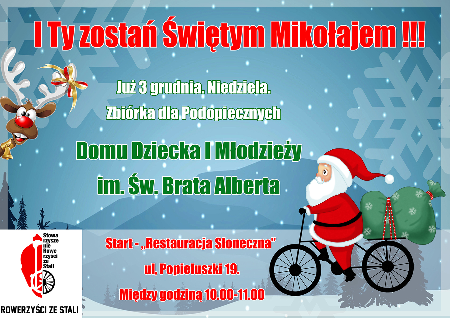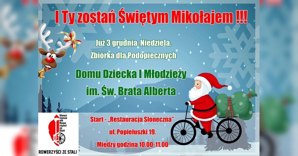 I Ty ZOSTAŃ ŚWIĘTYM MIKOŁAJEM. Wystarczy że kupisz coś od siebie i dnia 3 grudnia ( niedziela) dostarczysz w godz.10-11 pod restaurację SŁONECZNA. Tam czekać będą „Rowerzyści ze Stali” - każdy z nich ubrany będzie w strój Św. Mikołaja. Po zbiórce „biało-czerwony” kolarski peleton wyruszy do Domu Dziecka „Ochronka” im. Św. Brata Alberta, żeby przekazać dostarczone produkty.